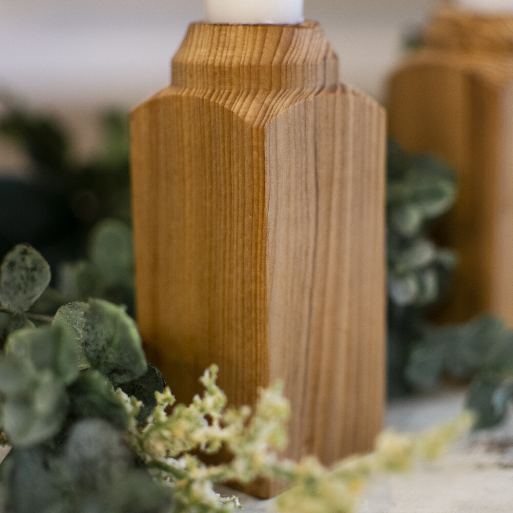 The simple silhouette of our Modo candlestick design elevates a taper with a waterfall turned top and square bottom. Polished with teak oil, this wooden candleholder brings natural beauty to any vignette in a modern, understated, yet elegant way.